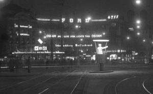 So zimperlich wie heute waren die Behörden früher aber nicht: Auf dem Foto von 1959 sorgt nicht nur die Osram-Reklame für taghelles Licht. Es zieren auch meterhohe Verbraucherinformationen von so alten Marken wir 4711, Scharlachberg Meisterbrand oder Ford das wohl schon damals denkmalschützenswerte Gebäude aus dem Jahr 1902.